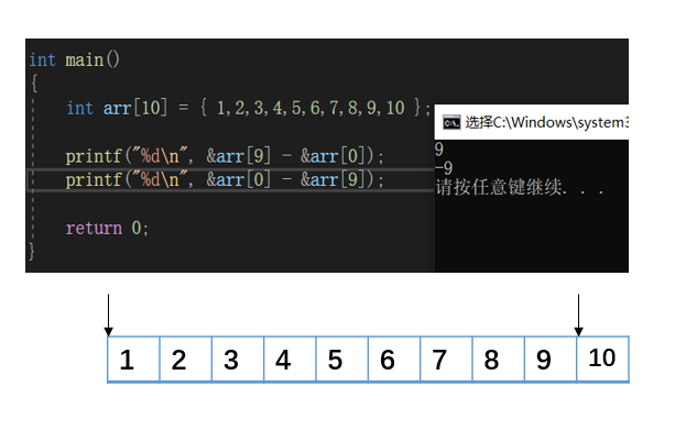 (2)指针-指针 结果的绝对值表示它们之间相隔的数组元素的数目,前提:两个指针指向同一块区域