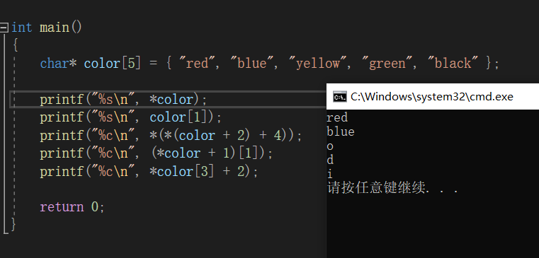 ②color[1]等价于*(color+1):color+1是数组第1个元素的地址,*(color+1)访问的是数组的第一个元素,它是一个字符指针,指向“blue”的首字符"b"