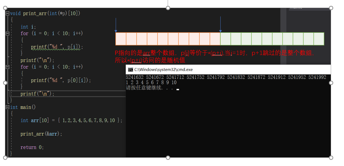 第一个for循环打印出来的是随机值的原因如图,解决方案为第二个for循环,我们可以把这个一位数组看成是二维数组的第一行,这样*(p+0)访问的是一维数组首元素的地址,然后(*(p+0))[i],就可以访问后面的元素了,(*(p+0))[i]等价于p[0][i]。其实,这样传参大可不必,太容易出错了,我们应该这样传参:print_arr(arr);然后用一级指针接收。