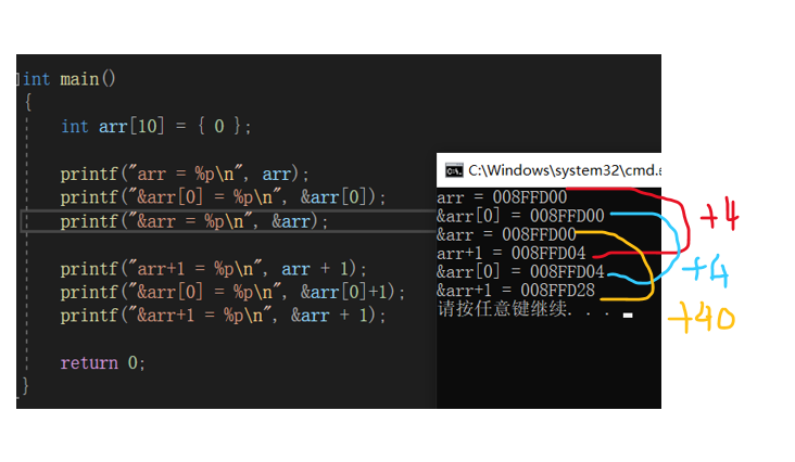 ③第三组的+40的解释:&arr是数组的地址,它的类型是int(*)[10],一个指向大小为10的整型数组的指针,所以它+1,应该跳过一个数组的大小10*4=40。