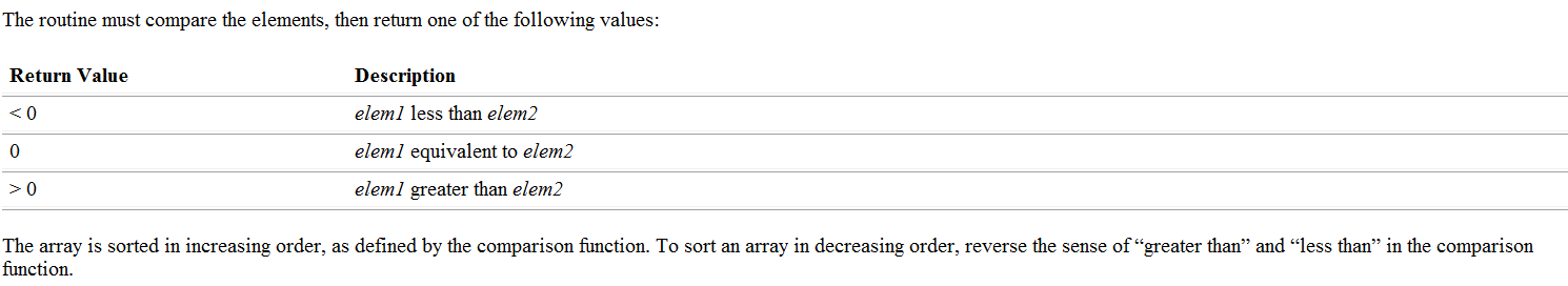 compare( (void *) elem1, (void *) elem2 );qsort在排序过程中调用该函数一次或多次,该函数比较两个元素并返回指定其关系的值,每次调用函数都会有返回值,如图: