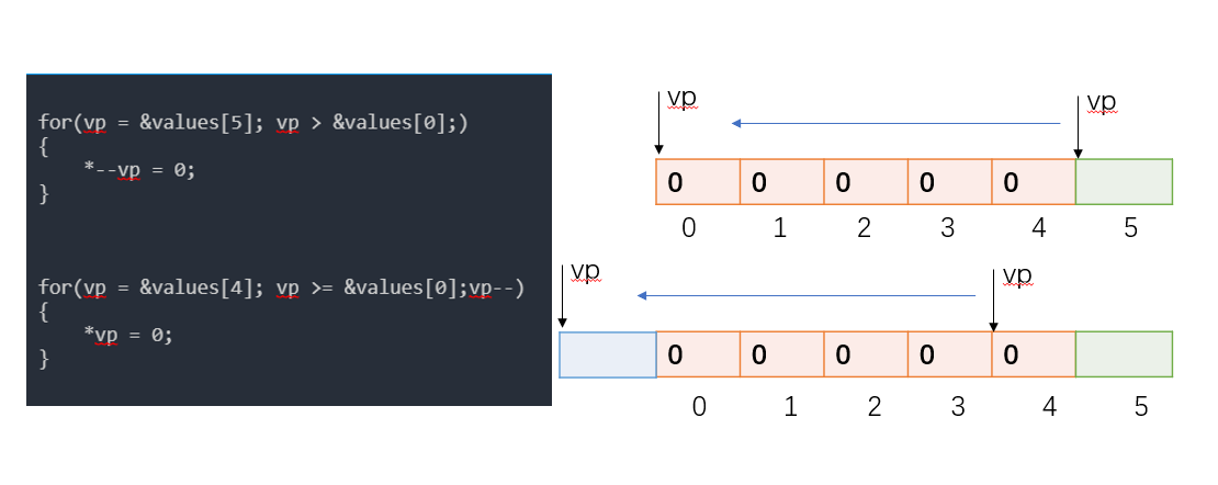 注意:C语言标准规定:允许指向数组元素的指针与指向数组最后一个元素后面的那个内存位置的指针比较,但是不允许与指向第一个元素之前的那个内存位置的指针进行比较。(第二种方法实际在绝大部分的编译器上是可以顺利完成任务的,然而我们还是应该避免这样写,因为标准并不保证它可行)