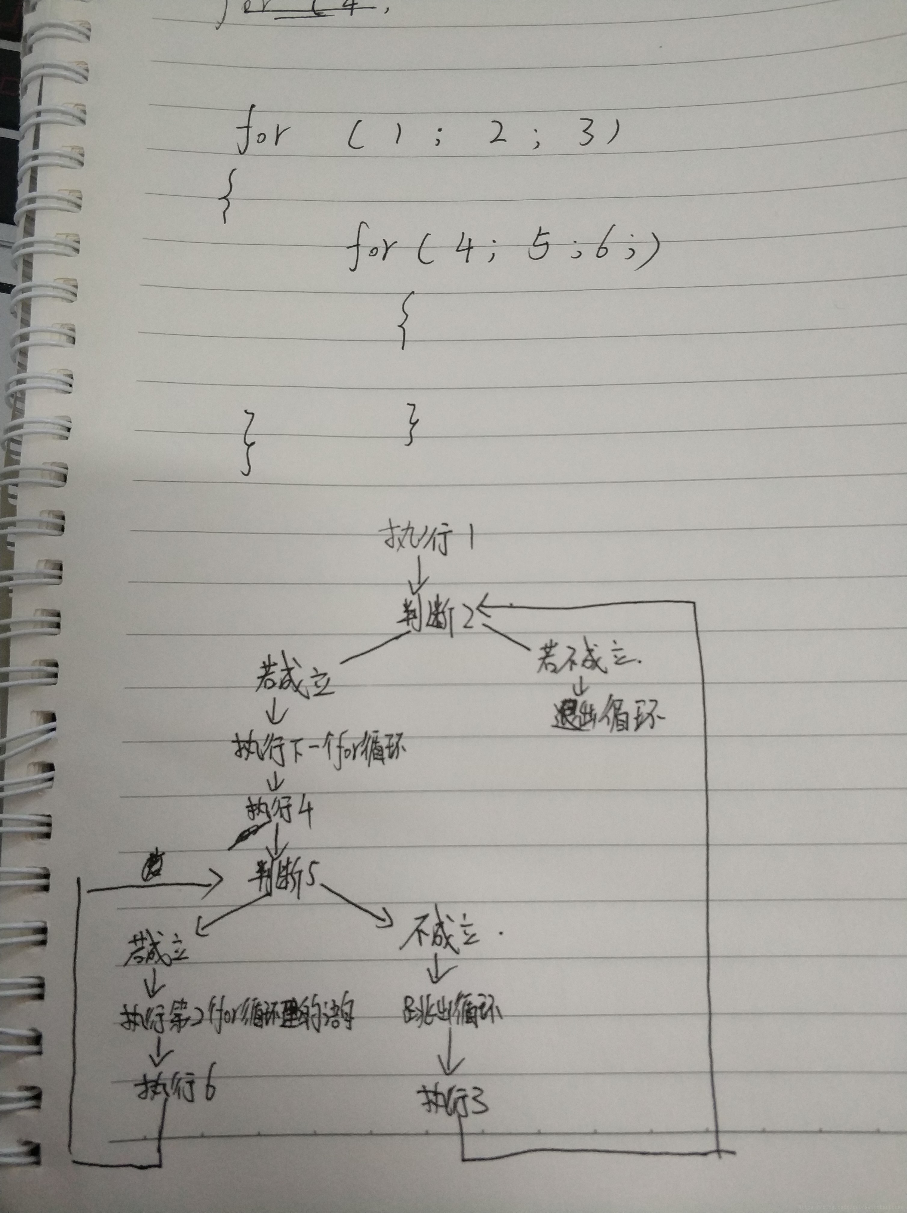 先执行第一个for语句,再进入第二个for循环,直到不满足5条件跳出第二个for循环;再执行第一个for循环的3;再继续第一个for循环;
