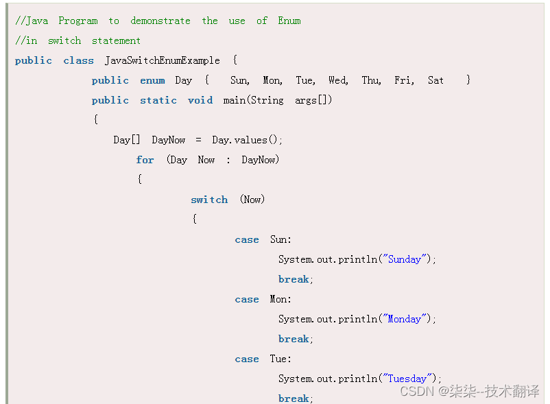 Java 允许我们在 switch 语句中使用枚举。 Java enum 是一个表示常量组的类。 (不可变的,例如最终变量)。 我们使用关键字 enum 并将常量放在用逗号分隔的花括号中。