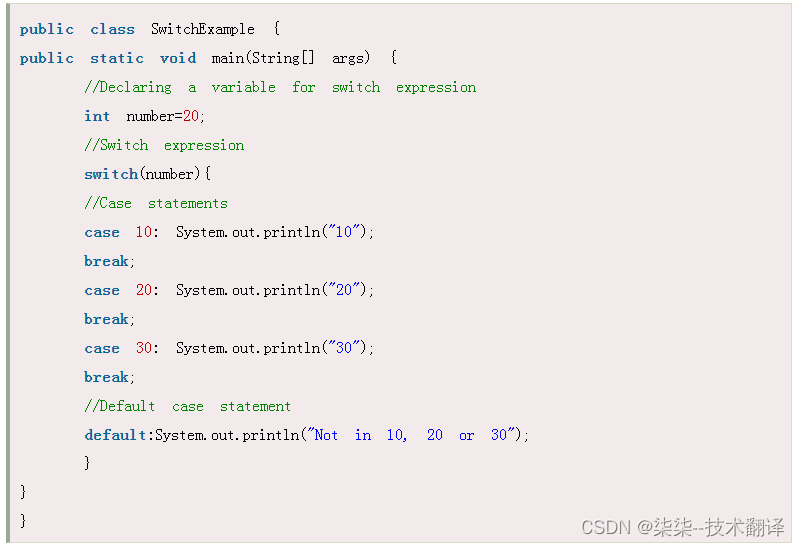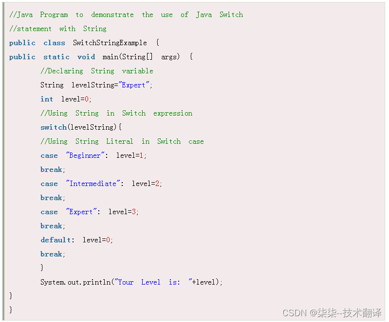 阶梯声明。 switch 语句适用于 byte、short、int、long、枚举类型、String 和一些包装器类型,如 Byte、Short、Int 和 Long。 从 Java 7 开始,您可以使用字符串