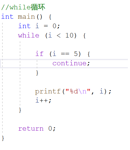 从代码的运行结果可以看出 ,并没有输出0~10,而是输出了0,1,2,3,4,并且输出完之后没有结束,而是不停的循环判断,原因在于当 i = 5,continue这个操作不在继续往下走,而是回到while(i < 10),继续判断,因为i = 5 < 10,所以会出现死循环。