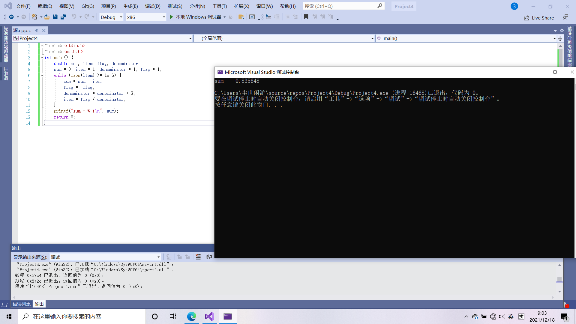 编写程序,计算1-1/4+1/7-1/10+1/13-1/16...的和,直到某一项的绝对值小于十的负六次方为止:
