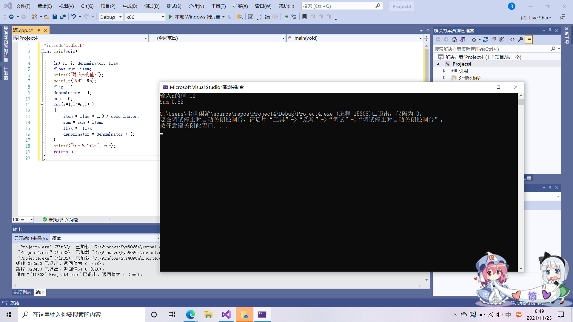 sum = 0; item = 1; denominator = 1; flag = 1;