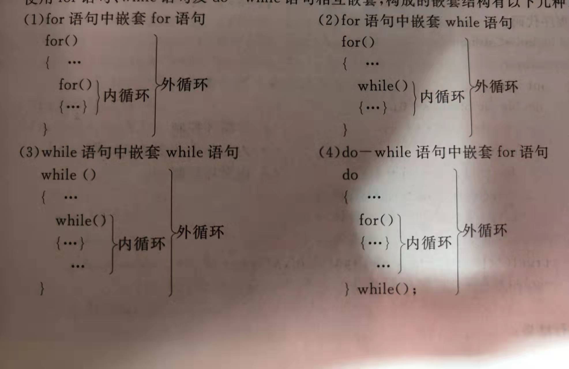 说明:循环变量赋值是一个赋值语句,用于给循环变量赋初值;循环条件是一个条件表达式,决定何时终止循环(即确定循环的终值);循环变量增量决定循环变量在完成一次循环后如何变化。三部分之间以“;”隔开。