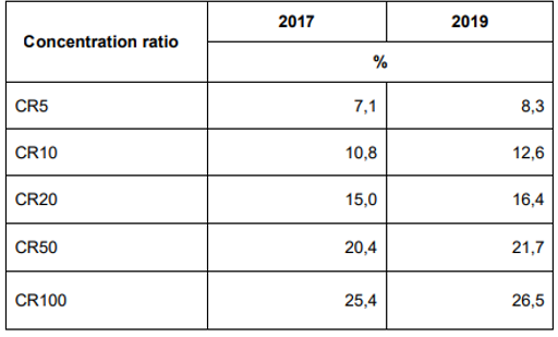 2019年,全球最大的100家企业(按总收入计算)农业和相关服务业占总收入的26.5%。农业产业的集中度在所有国家都有所提高。