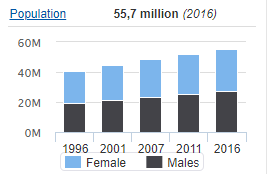 如图1所示,南非总人口从2011年的51770560人增长到2016年的55653654人,增长7.5%。男性:2016年为27247226,女性:2016年为28406428(人);青年(15-34岁):有201万人;正式住户占总数的79.2%;83.5%的家庭有管道供水,90.3%的家庭能用上电。