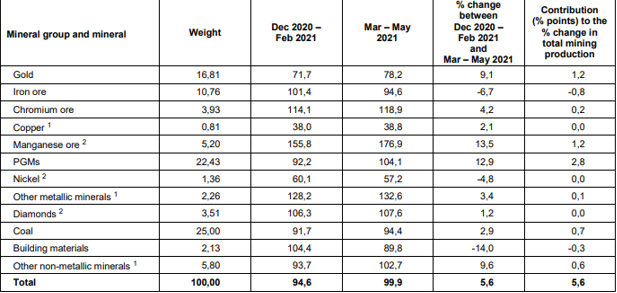在截至2021年5月的三个月内,经季节性调整的采矿产量较上年同期增长了5.6%前三个月。最大的积极贡献者是: PGM(12.9%,贡献2.8个百分点);黄金(9.1%,贡献1.2个百分点);和锰矿石(13.5%,贡献1.2个百分点。