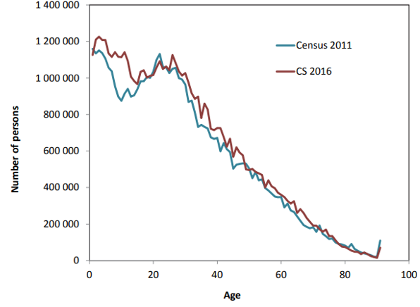 按年龄组分析显示在5-9岁人群中人口增长最大(从2011年的480万人增加到2016年为560万)。豪登省仍然是该国人口最多的省份,人口众多其中1340万人(24.1%)。各省的人口群体分布保持相对稳定从2011年开始,非洲黑人占所有省份人口的五分之四以上西开普省和北开普省除外。性别比例保持相对稳定(2011年为95,2016年为95)。