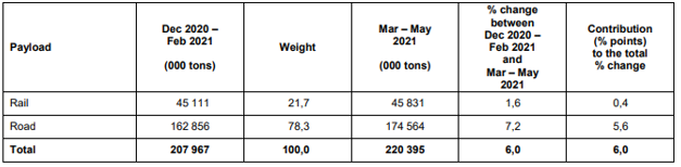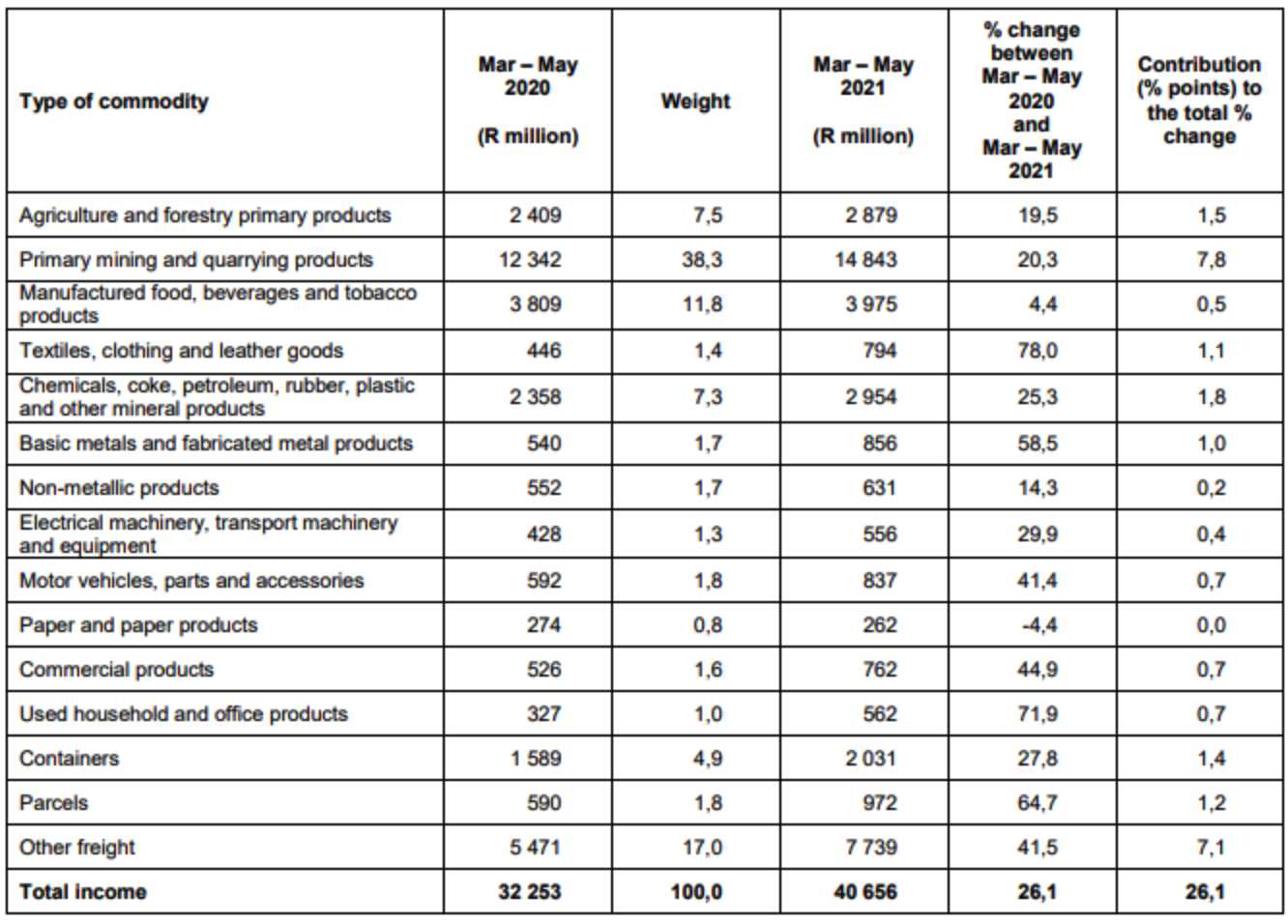 在截至2021年5月的三个月内,货运收入同比增长26.1%。这一增长的主要原因是: 初级采矿和采石产品(20.3%,贡献7.8个百分点);和其他“运费”(41.5%,贡献7.1个百分点)