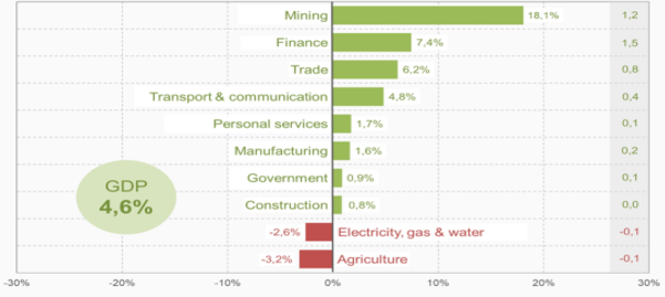 金融、采矿和贸易行业是经济生产(供应)方面产出的主要驱动力,而家庭支出和库存变化有助于刺激支出(需求)方面的增长。