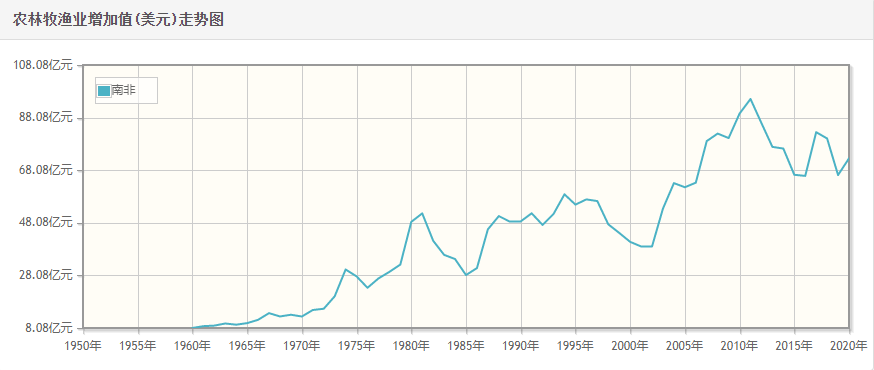 2020年南非农林牧渔业增加值为72.59(亿美元,下同)相比上年增长6.36亿美元(8.76%)。1960年以来农林牧渔业增加值波动性增长,近5年波动较大,总体呈上升趋势。