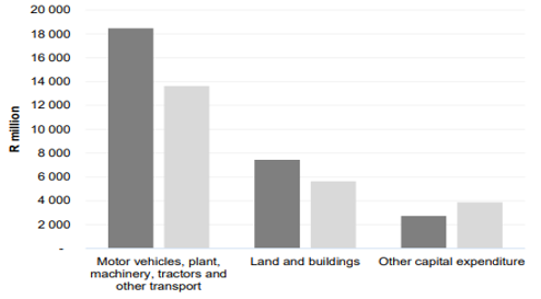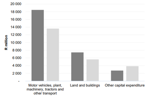 2017年和2019年服务业农业和相关行业新资产的总资本支出2019年的服务业总额为330亿南非兰特,而同期为186亿南非兰特2017年,年化减少9.8%“机动车辆、厂房、机械、拖拉机和其他交通工具”报告了最大跌幅(-48亿南非兰特,从185亿南非兰特降至137亿南非兰特)。