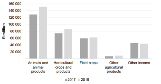 按产品类别划分的收入农业和相关服务业的总收入为2019年为1514亿南非兰特,2017年为1140亿南非兰特。总收入数据显示,2017年至2019年间的年化增长率为5.8%2019年,“动物和动物产品”的销售额最大(1531亿南非兰特),其次是“园艺作物和产品”(863亿南非兰特)和“大田作物”(619亿南非兰特)。收入的年化增长率最高从“动物和动物产品”销售中获得的收入(9.1%),其次是“园艺作物和产品”(8,0%)和“大田作物”。