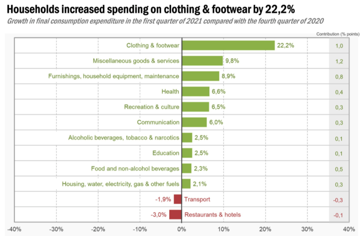 家庭最终消费支出在第一季度以每年4.7%的速度增长,主要受杂项商品和服务、服装和鞋类以及家具、家用设备和维护的推动。