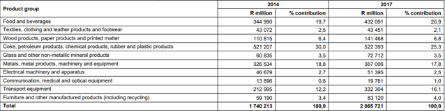 2017年,制造业自有制造产品的总收入为20657亿南非兰特。收入比报告的收入每年增加5.9%,在2014年的相应调查中(7402亿南非兰特)。与2014年和2017年相比,“运输设备”(+1193亿南非兰特)、“食品和饮料”(+871亿南非兰特),“金属、金属制品、机械和设备”(+405亿南非兰特)和“木制品、纸制品和印刷品”(+307亿南非兰特)。