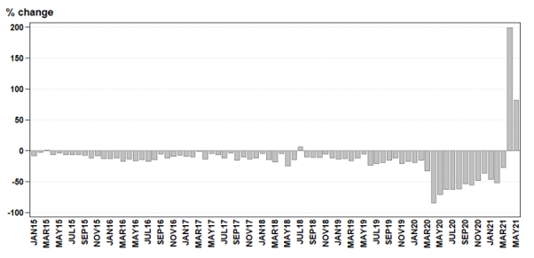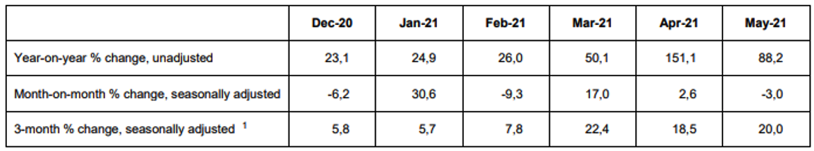 2021年5月,按现行价格计算的矿产销售额同比增长88.2%。最大的积极贡献者是:PGM(258.2%,贡献68.7个百分点); 铁矿石(116.0%,贡献16.3个百分点);煤炭(12.5%,贡献3.1个百分点)。与2021年4月相比,2021年5月按现行价格计算的经季节性调整的矿产销售下降了3,0%。随后,2021年4月和2021年3月的月度变化分别为2.6%和17.0%。在截至2021年5月的三个月内,按现行价格计算的经季节性调整的矿产销售价值为20,0%与前三个月相比有所上升