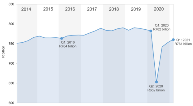新冠疫情和随后的封锁限制对南非经济造成了重大破坏。2020年第一季度(1月至3月)的实际GDP为7820亿南非兰特。在2020年第二季度(4月至6月),当封锁限制最为严格时,经济产出下降至6520亿南非兰特。