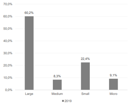 按企业规模划分的农业和相关服务业收入工业,2019年大型企业贡献了2010年总收入的60.2%,即1113亿南非兰特2019年,其次是小企业,贡献率为22.4%,即78.8南非兰特十亿。微型企业和中型企业分别占9.1%和8.3%。