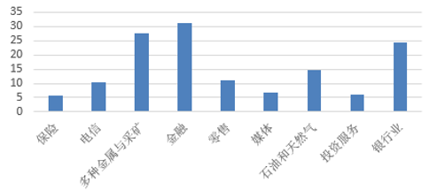在进入福布斯世界知名企业名单中,金融类行业占比最多,这与南非行业占比表中的特征相似。