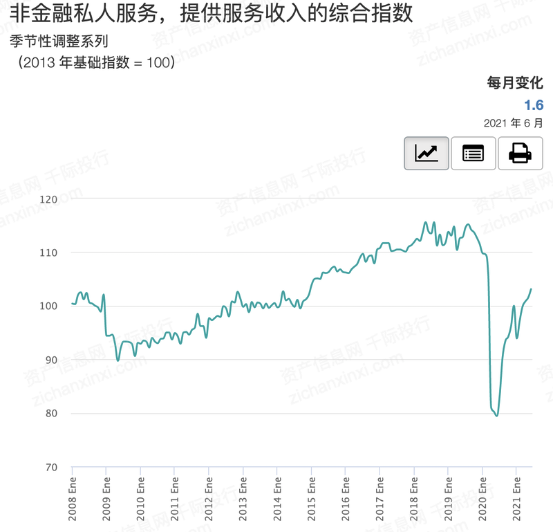 经季节性调整后的数据,2021 年 6 月期间,非金融私营服务的商品和服务供应的实际总收入增长了 1.6%
