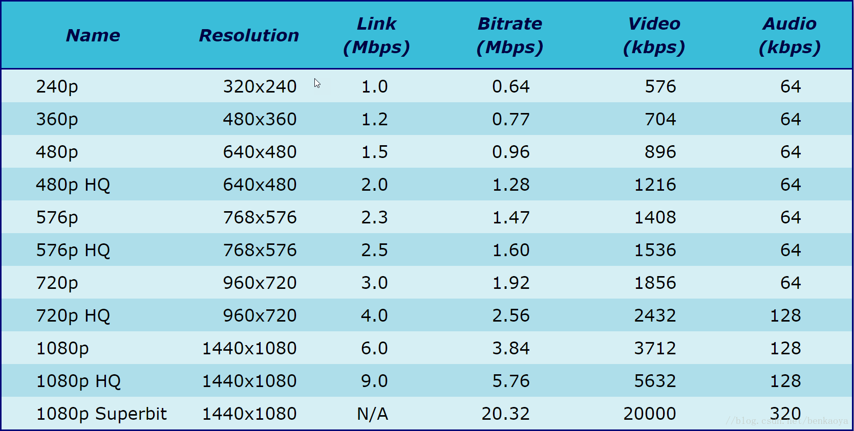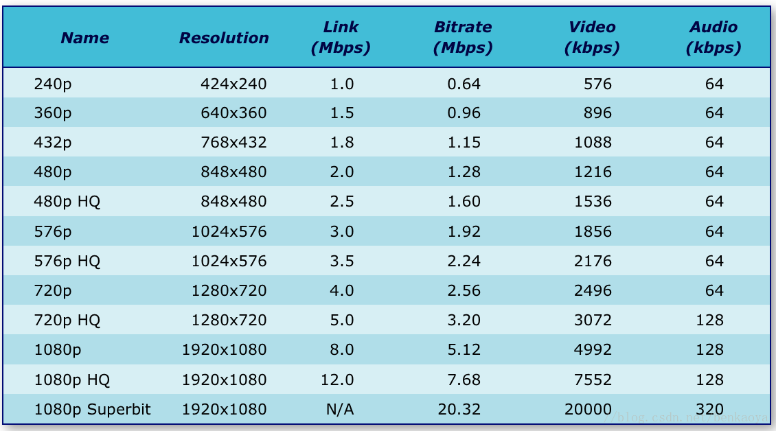 针对H.264编码格式,根据不同分辨率,推荐其对应的码率配置关系如下图所示: