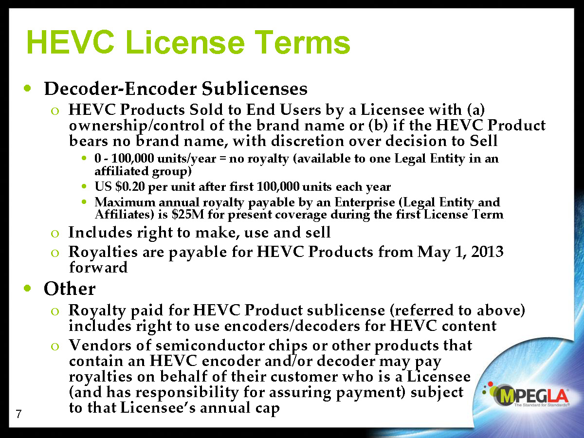 MPEG LA还延续着以往的收费习惯,终端销量在10万台以下的不收费,超过的部分每台收取0.2美元的授权费,封顶费用相比于H.264大幅提高,每年2500万美元。值得一提的是,MPEG LA针对视频内容不再单独收费。