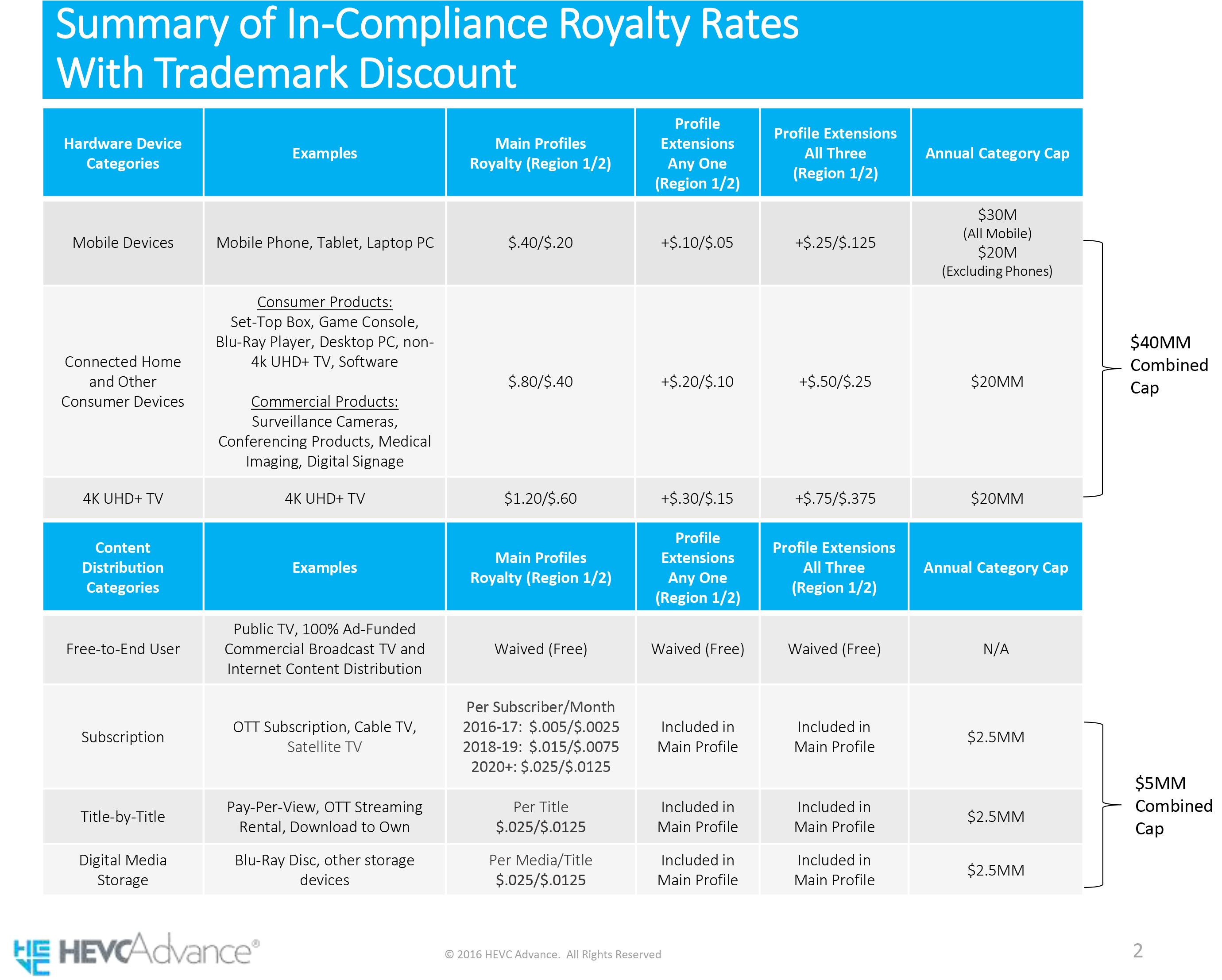 相比之下HEVC Advance就没那么厚道了。不仅收费范围广,涵盖了电视、智能手机、流媒体播放器、机顶盒、游戏主机、数字媒体存储设备、监控设备等几乎所有的硬件终端以及Netflix、YouTube等内容提供商,而且费用极其高昂,虽然下调了一次,但仍比MPEG LA的收费高出许多:终端设备要缴纳0.2-1.2美元不等,封顶年费4000万美元。在内容方面,除了对终端用户提供免费内容的供应商外,其他内容提供商也要根据订阅数、节目数和媒体数收费,封顶年费500万美元。