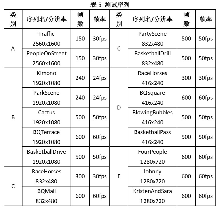 测试序列选择HEVC通测条件中给定的序列,为了使测试更加全面,我们选取Class A~Class E来进行测试,分辨率包含240P~1600P。测试序列的具体情况如下: