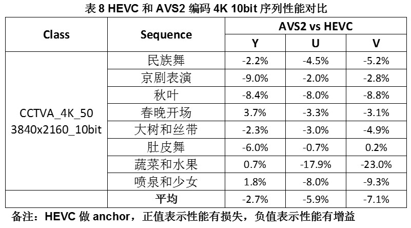 从测试结果中可以看到:对于4K 10bit序列HEVC的编码效率普遍低于AVS2,个别序列甚至差了将近10%,平均性能损失为3.0%。这也意味着,在超高清领域AVS2编码性能略优于HEVC。