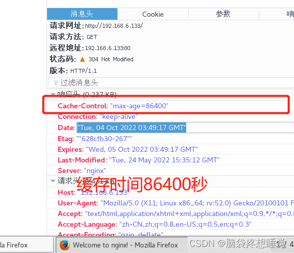 浏览器访问测试 在Linux系统中,打开火狐浏览器,右击点查看元素 选择 网络 ---> 选择 HTML、WS、其他 访问 http://www.benet.com ,双击响应消息查看响应头中包含 Content-Encoding: gzip