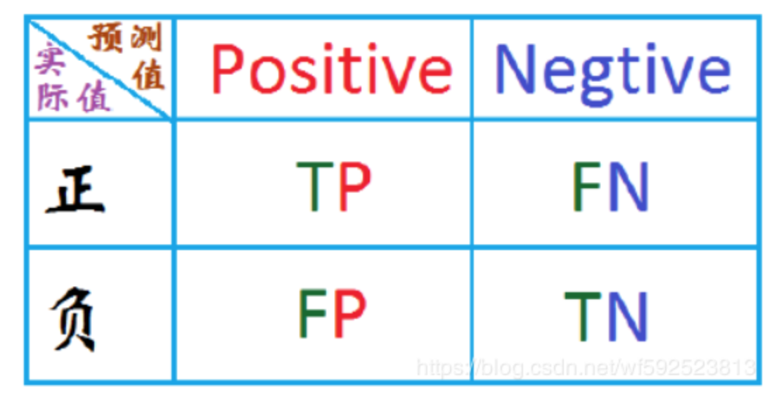 第一个字母表示分类正确与否, T 表示分类正确, F表示分类错误; 第二个字母表示分类器判定结果, P表示判定为正例, N表示判定为负例。