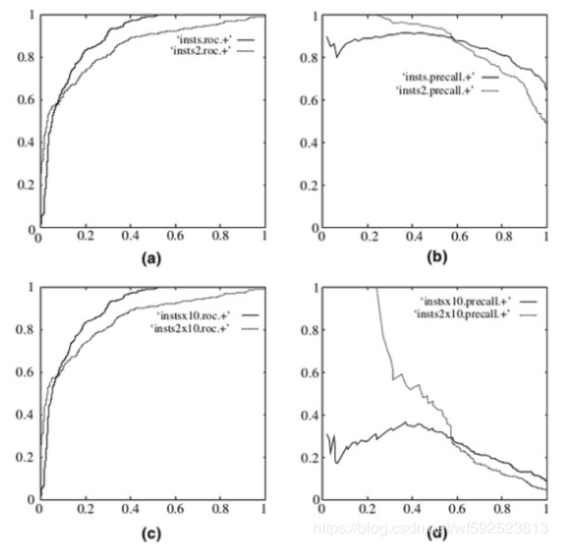 a,c为ROC曲线,b,d为P-R曲线;a,b 为在原始测试集(balanced)上的结果(两个2分类器的ROC曲线和P-R曲线),c,d为把原始数据集的负样本增加10倍后的结果。很明显,ROC曲线基本保持不变,P-R曲线变化较大。