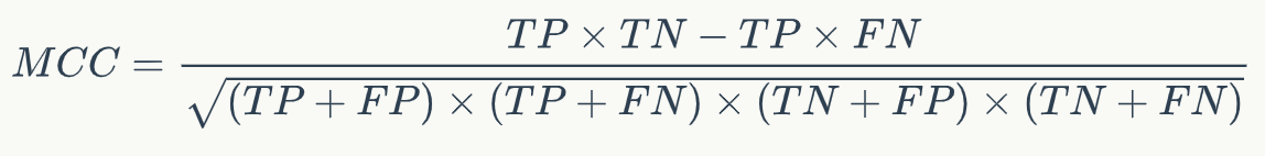 MCC 主要用于衡量二分类问题,其综合考虑了 TP TN, FP , FN, 是一个比较均衡的指标, 对于样本不均衡情况下也可以使用。MCC的取值范围在 [-1, 1], 取值为1 表示预测与实际完全一致, 取值为0表示预测的结果还不如随机预测的结果, -1 表示预测结果与实际的结果完全不一致。因此我们看到, MCC 本质上描述了预测结果与实际结果之间的相关系数。