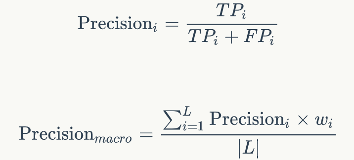 分别计算第i类的Precision、Recall和F1-score(把第i类当作正类,其余所有类统一为负类),然后进行平均(假设总共有L个类):