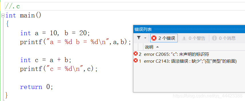//.c文件(C89)语句之后不能再定义变量,否则编译不通过(比如在执行printf语句之后不能再定义变量)
