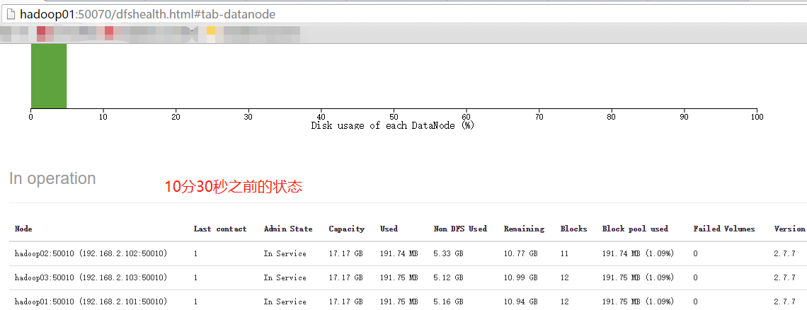 hadoop-daemon.sh stop datanode #关闭一下namenode等待10分30秒后才会判定为namenode掉线死亡。