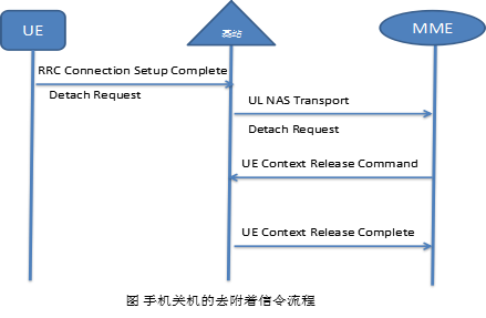 手机关机将会触发终端发送去附着请求Detach Request ,其中去附着的类型为关机(Switch Off)。由RRC Connection Setup Complete 承载,之后终端进入关机状态。