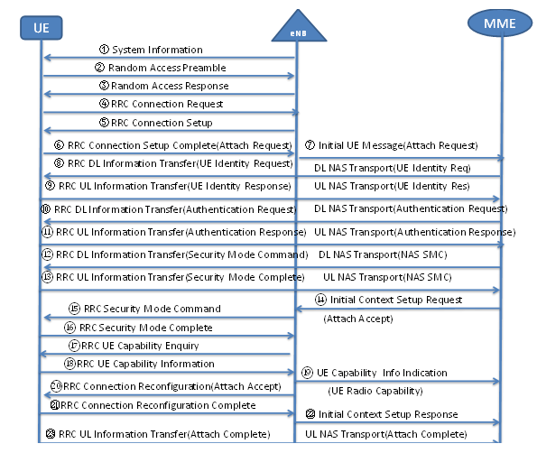 - 附着流程,终端开机时执行,终端从待机进入联机状态后,往往还会返回待机状态。