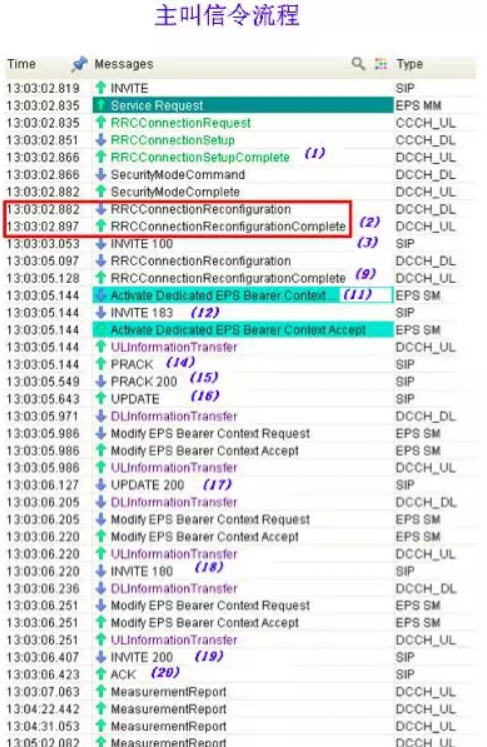 9)主叫建立QCI1的数据无线承载,用于承载语音数据,使用UM方式。例如本例中,eps-BearerID=7,DRB-ID=5。关键参数包括头压缩参数,TTI Bundling,SPS。DRX参数也会按照语音业务的要求进行重新配置。