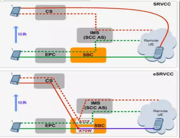 eSRVCC与SRVCC方案区别点在于前者 在 IMS 系 统 中 新 增 了 一 对 功 能 实 体 :ATCF(Acess Transfer Control Functionality,接入 转 移 控制 功 能 )和 ATGW(Access Transfer Gateway,接 入 转 移网关),分别作为 VoIP 呼叫 在控制平面和用户平面的锚定点。两者对比如下图所示: