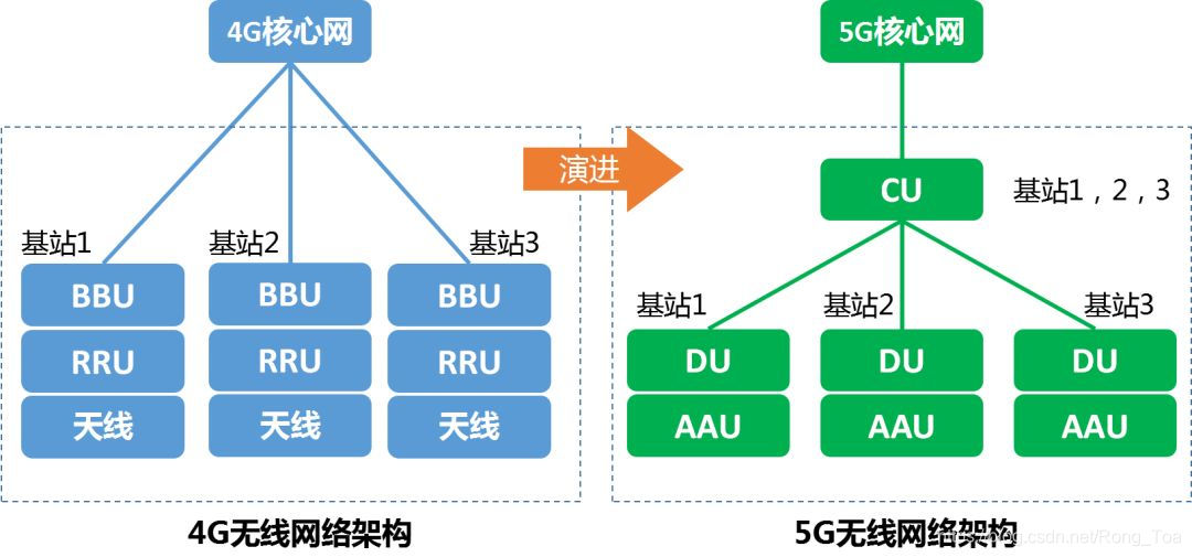 4G和5G无线接入网部分的架构有什么不同: