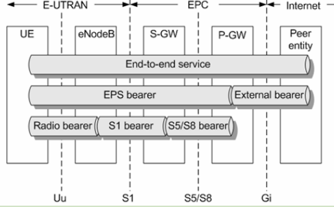 在LTE系统中,一个UE到一个P-GW(PDN-Gateway)之间,具有相同QoS待遇的业务流称为一个EPS (Evolved Packet System)承载,如下图所示: