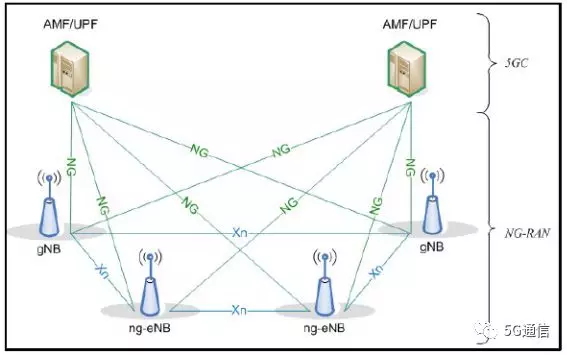 其中 gNB 和 gNB 之间,gNB 和 ng-eNB 之间,ng-eNB 和 gNB 之间的接口都为 Xn 接口