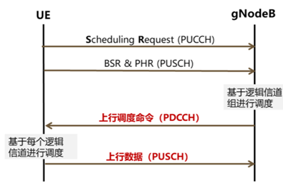 - 上行调度由UE触发和维持,消息包括“Scheduling request”,“Buffer status report”,“Power headroom report";
