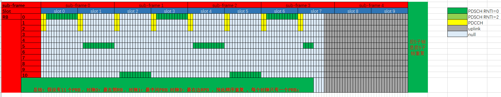 总结:时隙0:最左侧RB ,时隙1:最中间PRB 时隙3:最右边RPB ,按此顺序重复 。每个时隙只有一个PRB;假设有11 个PRB